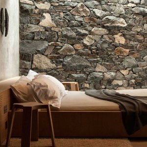 Stone walls and glass facade of this contemporary home add another dimension to the landscape. Embraced by luxury and modern comforts, a super king-size bed sits a step up from living area with fireplace, next to the modern bathroom.