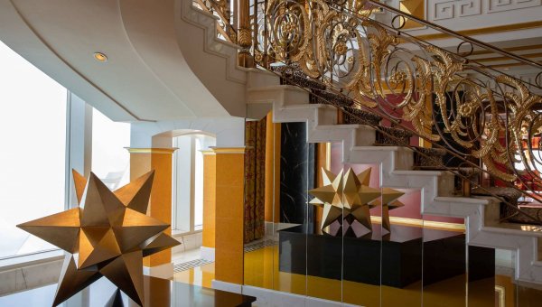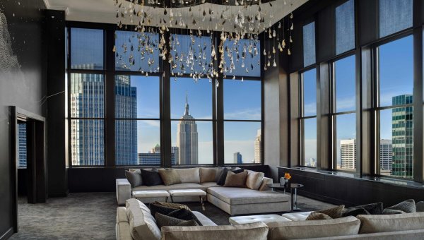 Created in collaboration with acclaimed jewellery designer Martin Katz, the multifaceted New York City Jewel Suite encompasses 5,000 square feet in an extravagant triplex, one of the most imaginative and opulent luxury suites in Manhattan. Radiant, Art Deco-inspired elements anchor the aesthetic, reflecting the rich glamour of the early Twentieth Century against sweeping views of the dramatic Manhattan skyline. The entry and grand staircase of The Jewel Suite in New York celebrate light and reflection with a two-story “cascading crystal” chandelier in sculptural harmony with floating jewellery displays showcasing Katz creations valued in excess of $1.5 million.