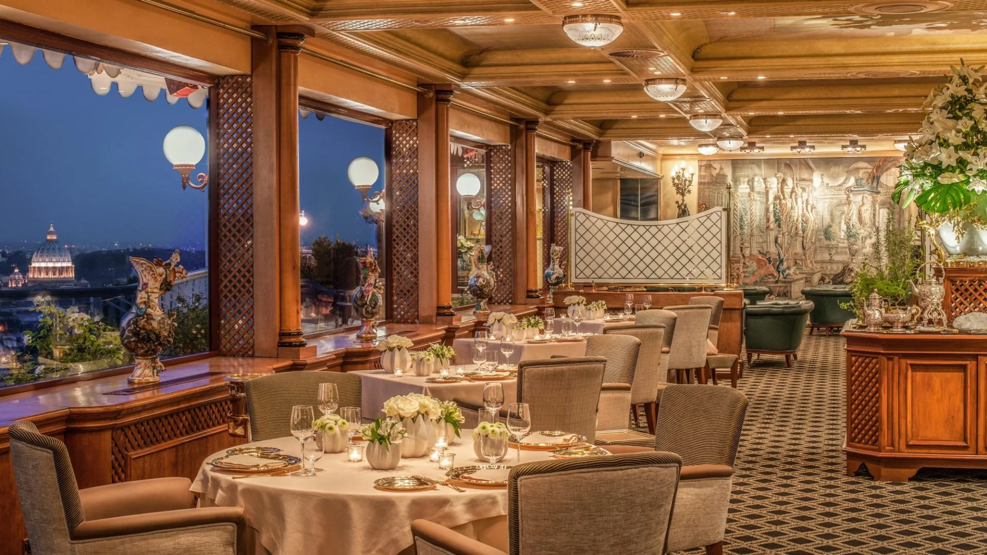La Pergola, Rome's renowned rooftop garden and Italy's most globally influenced restaurant offers an ambiance of timelessness and sophistication. From its terrace, Rome unfolds as an eternal and serene panorama, living up to its frequent descriptions. The setting exudes a subdued elegance, with carpets, armchairs, silverware, fresh flowers, paintings, and refined furniture enhancing the magnificent backdrop for breathtaking views. The restaurant's remarkable wine cellar proudly houses over 65,000 bottles, adding to the overall grandeur of the dining experience.