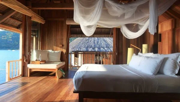 The three private bedrooms each offer tailored configurations, exposed beam ceilings and air-conditioned, ensuite bathrooms equipped with crafted wooden bathtubs and fixtures. The living room features a comfortable seating on which guests can relax while enjoying the villa’s 56-inch HD television and digital entertainment system featuring over 200 movies.